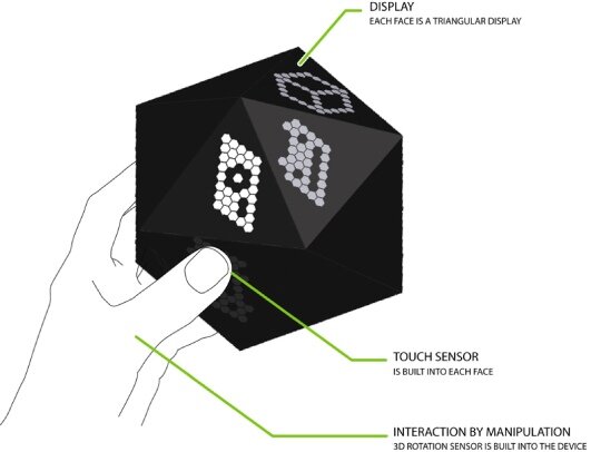 Figure 2. D20 is a concept of multifaceted handheld display device, shaped as a regular icosahedron. The user interacts with it by rotatingit and touching its faces [5]. The visual interface is structured totake advantage of the device shape.